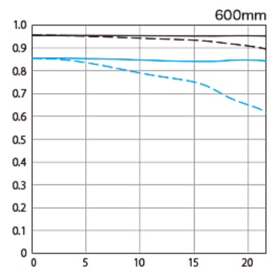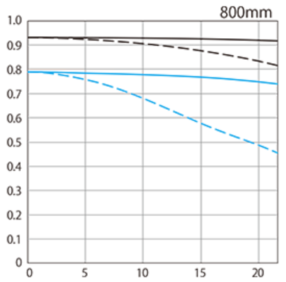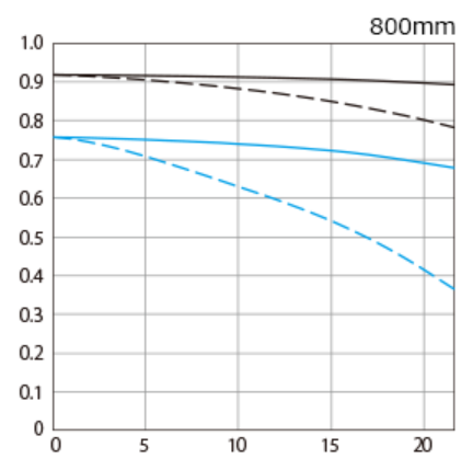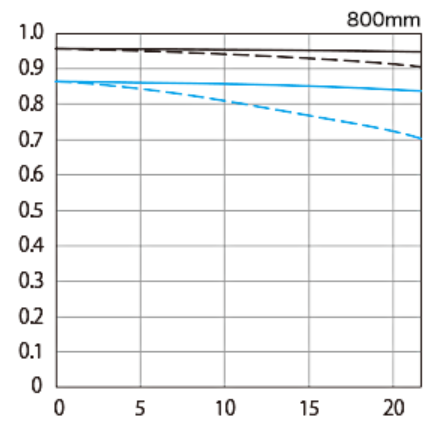 RF200-800mm F6.3-9 IS USMはチャートを見てもわかる通り、ズームにしては周辺に向けての解像力の低下は7mmくらいまでは頑張ってこらえているので、かなり優秀と言えます。