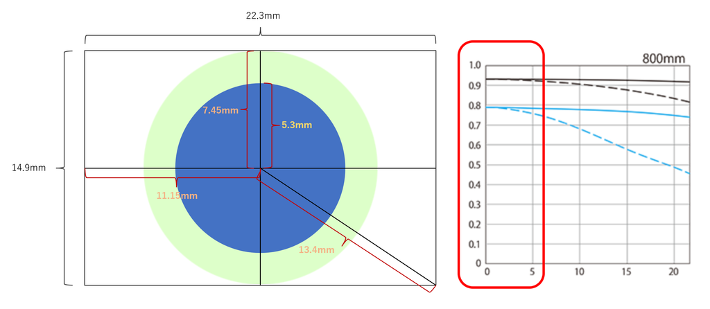 ですが、実際の撮影ではそんな端っこでは撮らないのと野鳥の場合は距離もあるので大体中心から半径5.3mmくらいの範囲がどうかで評価すればいいんじゃないかな?と思ってます(センサー図の青丸、MTFチャートの赤枠)。