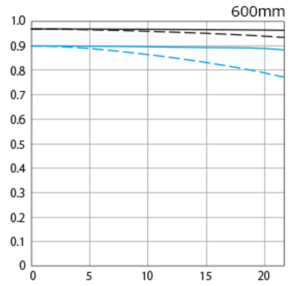 中心からの対角線の長さは13.4mmですのでMTFチャートの横軸は13.4mmまでを見れば四隅までの解像度が大体わかります。