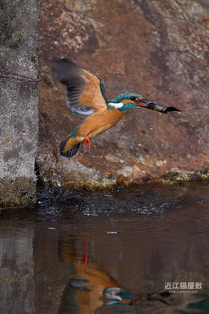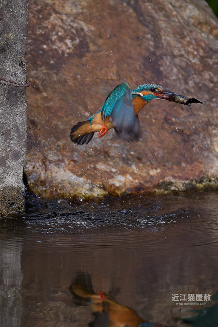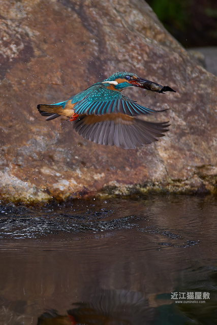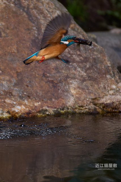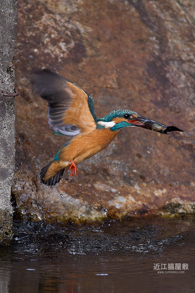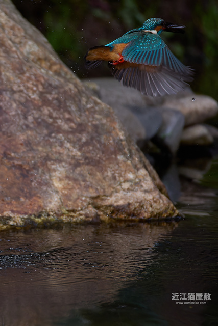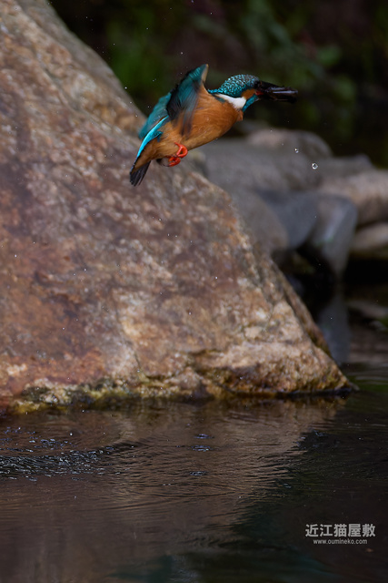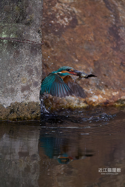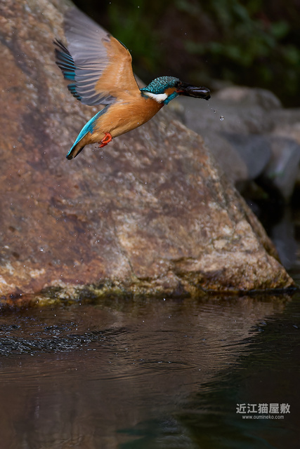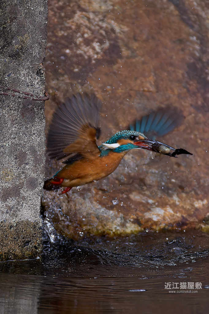 偶然の要素はありますが、岩の隙間からエサを咥えて飛び出してくる躍動感のあるカワセミ写真になりました。