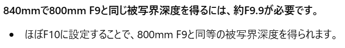 840mmの場合はF10くらいにすればRF200-800mm F6.3-9 IS USMと同じくらいの被写界深度にできますが、ちょっと解像力的に厳しくなる感じですね。