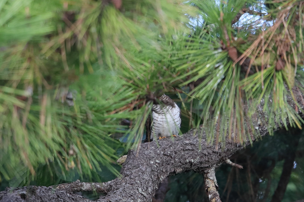 警戒心が高いといえばツツドリ。かなり遠くに顔は松で隠れた状態しか撮れず。