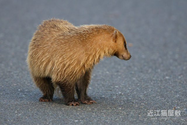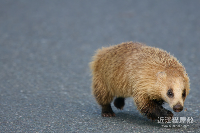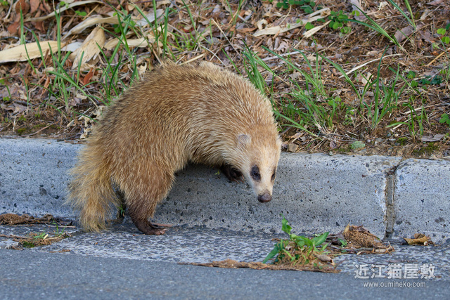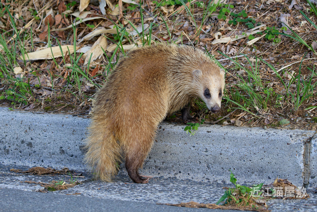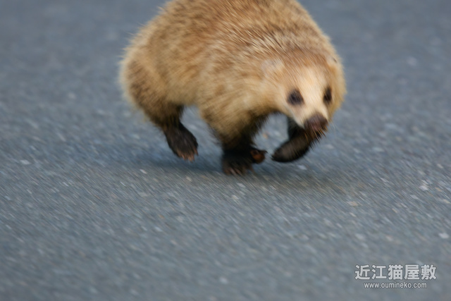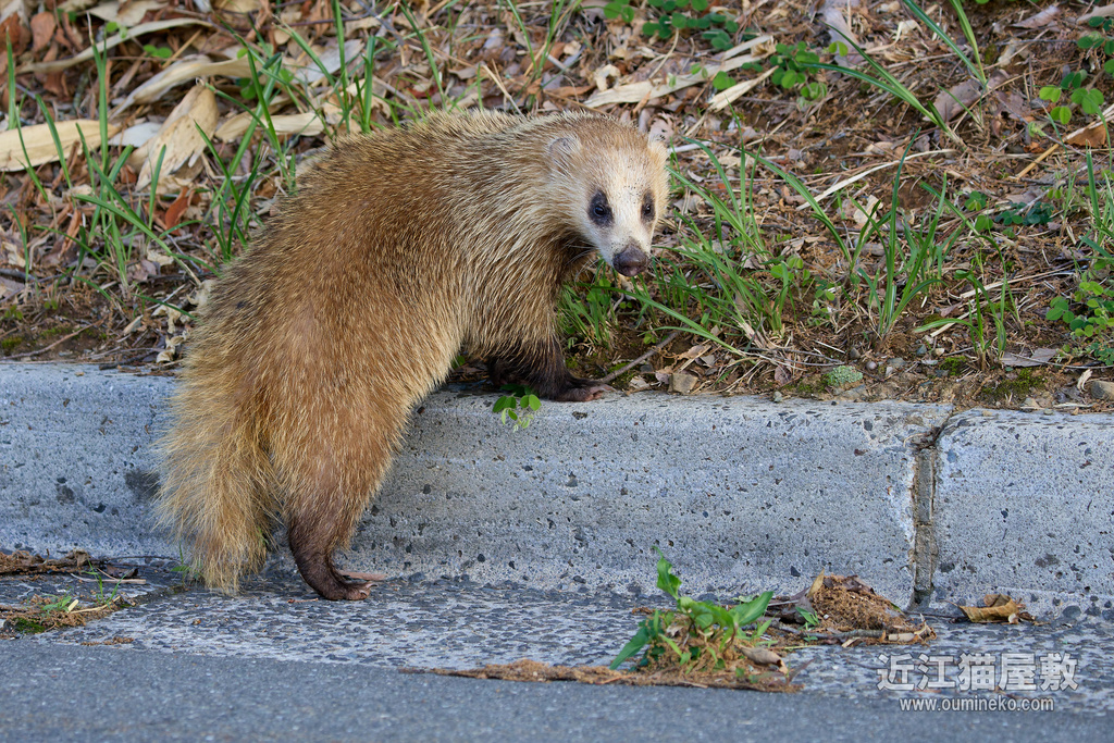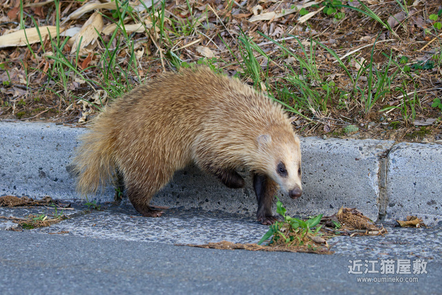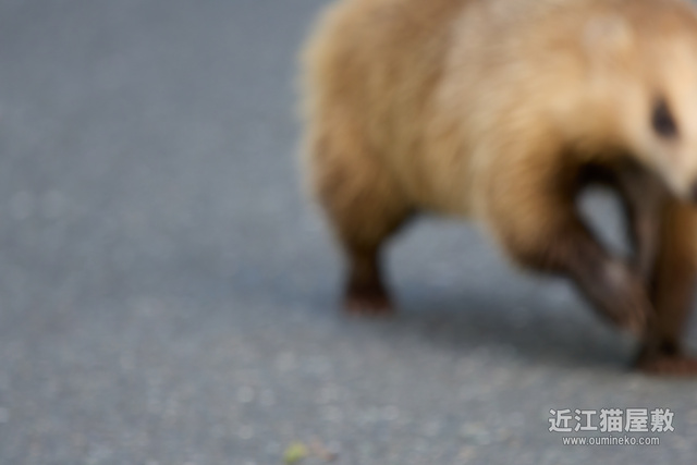 その後、ようやく私に気づいて路肩から藪に逃げようとするアナグマ。