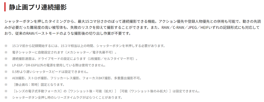 15コマということですが、プリ撮影状態からの連写でどのくらいもつのかなどは気になっていたりします。