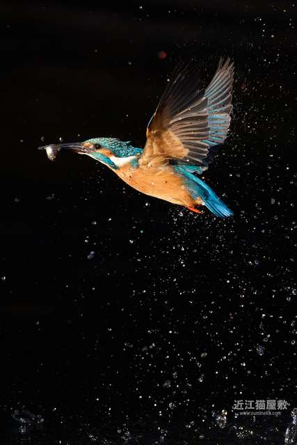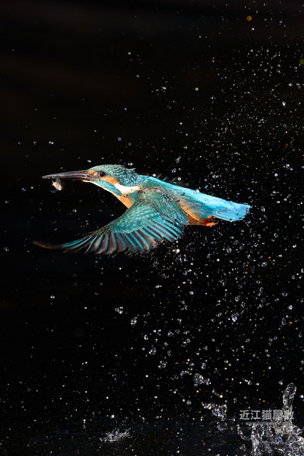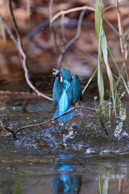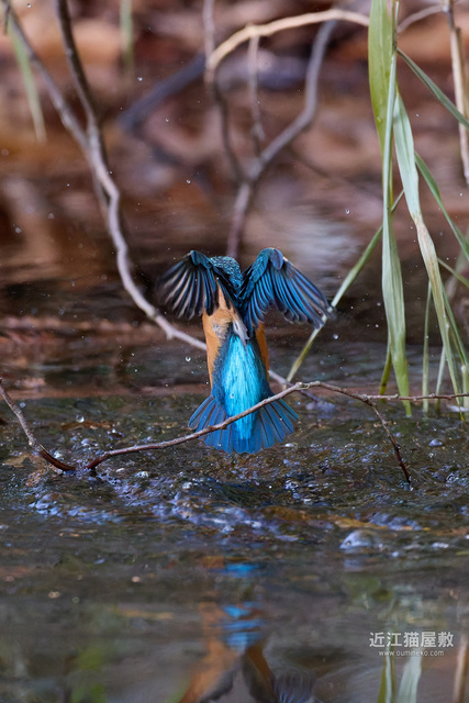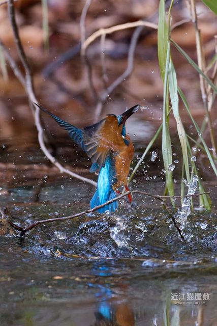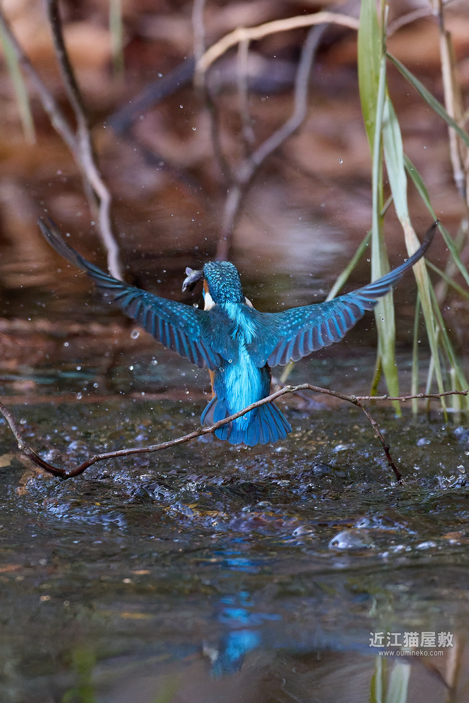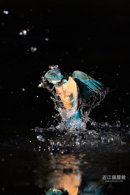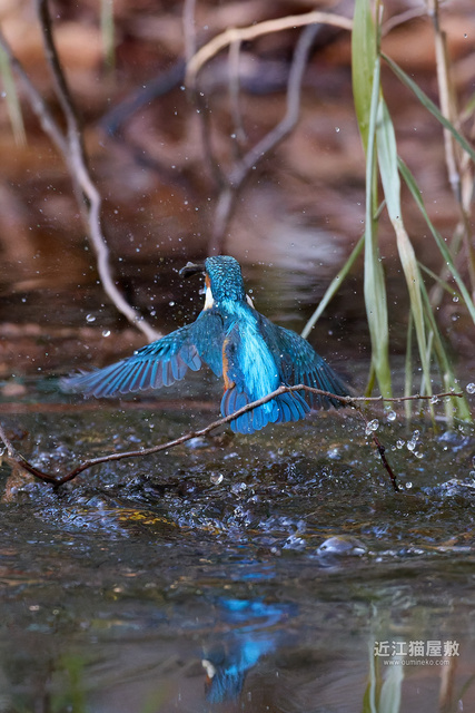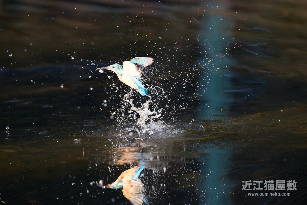 水面の光を見てわかると思いますが、カワセミが飛び込んだ場所だけまるでスポットライトを当てたかのように夕日が直撃。