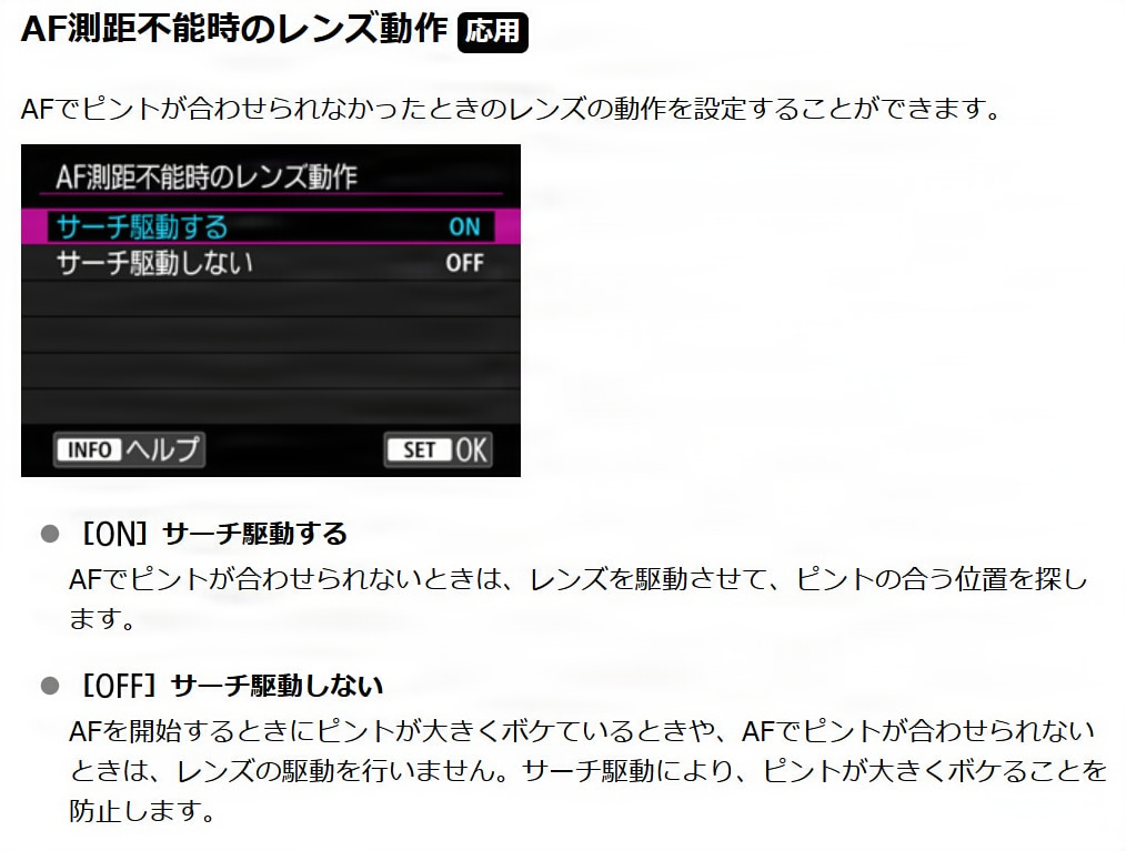 | サーチ駆動OFF | せめて、「ピントが奥に合った」→「仕方ないのでMFで近くまで」→「AF-ONしたらまた奥に合った」→「仕方ないので....」...は避けたいので試してみましたが、これはサーチ駆動しなくなると平時がつらすぎる(何にもピントが合ってないときに全くAFが動かない)ので却下。 |