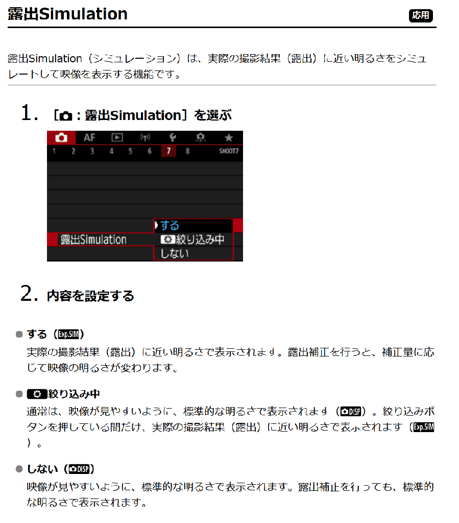 | 露出SimulationをOFF | これは、画像認識の面では有効なようですが、手前にピントが合わない問題の解決にはなりませんでした。 |