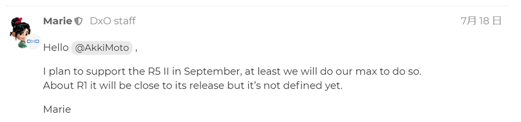 DxOのサポートBBSでは9月中、できるだけ早い時期に対応するとDxO Staffがこたえていますね。