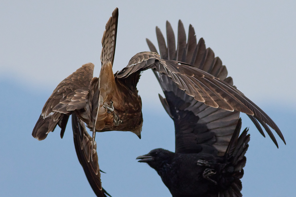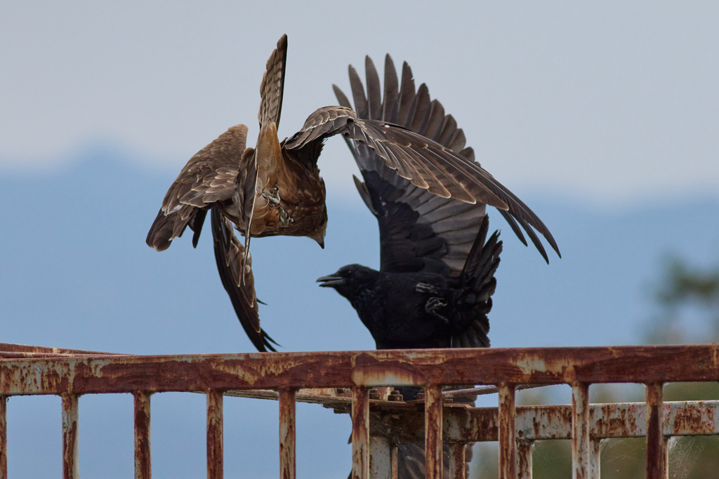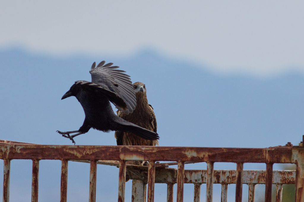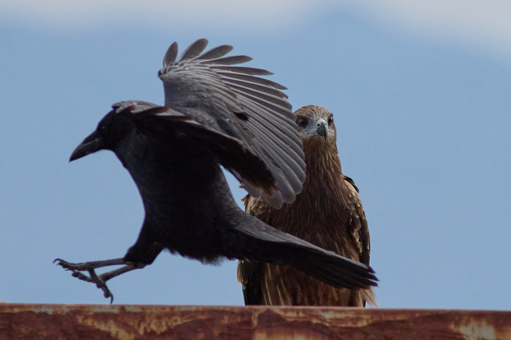 カラスがトビを挑発してますが、トビが平静さを装うのに苦労してそうで面白く。