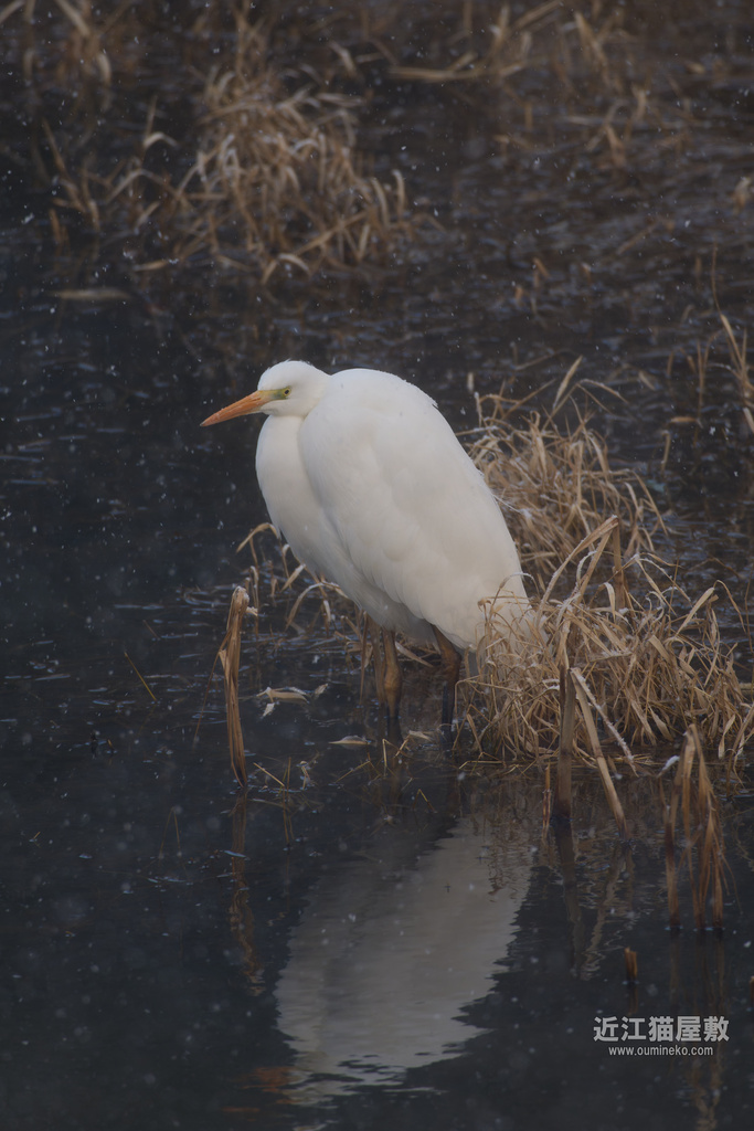 かなり吹雪いてきたので帰路についたのですが、池でちょこんと白鷺がいて風流だったのでパシャリ。