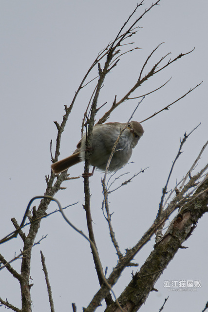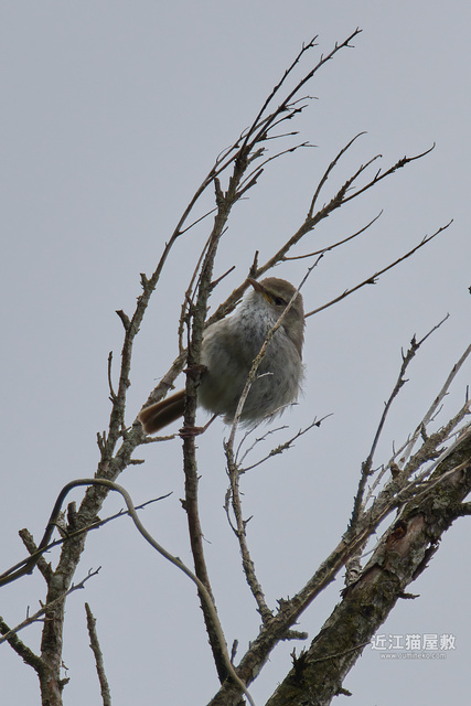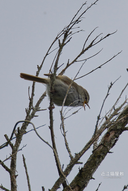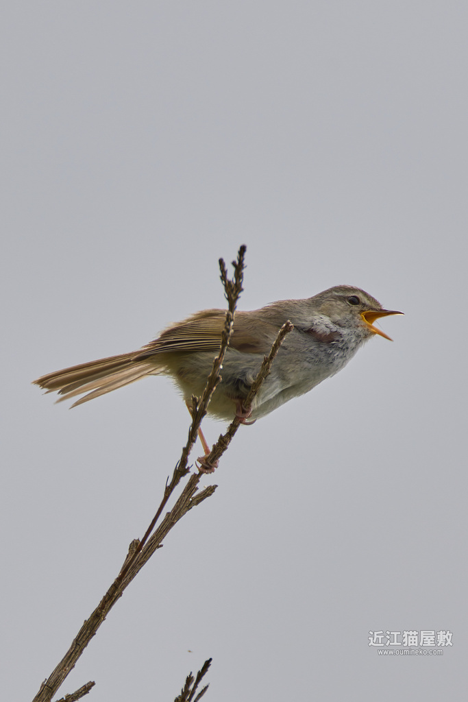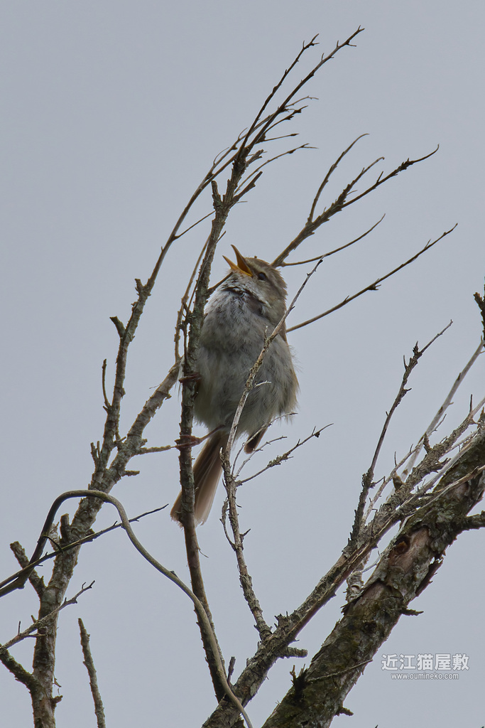 あまり見晴らしの良い枝に出てきてくれることの少ないウグイスですが、今日は数回こういうシーンに出会いました。