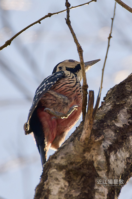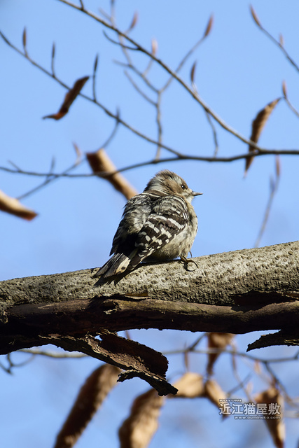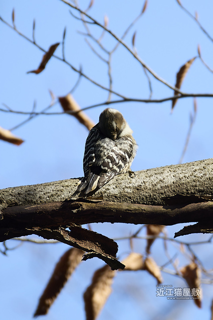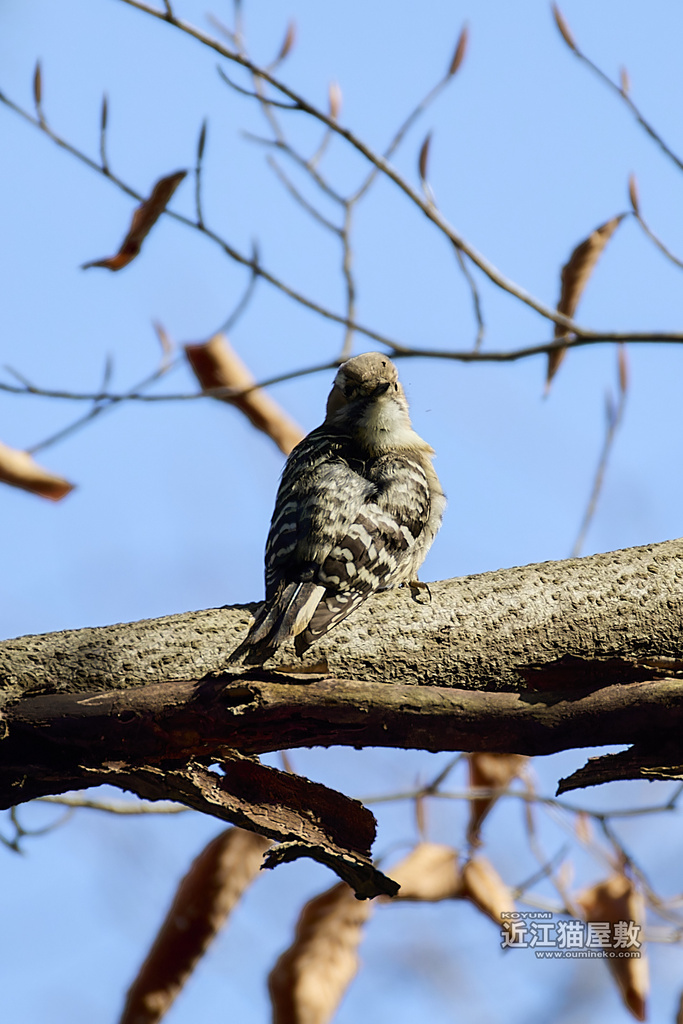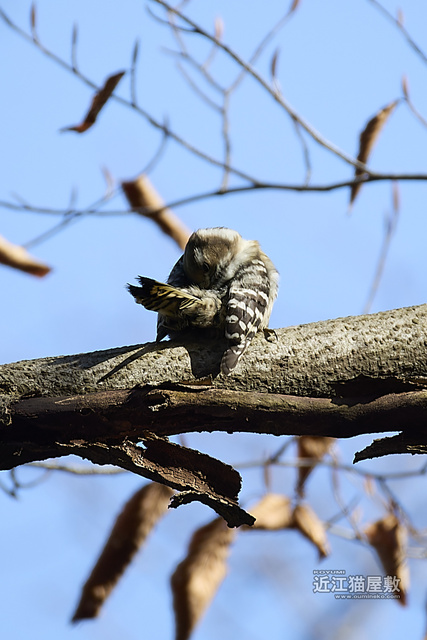 コゲラはひたすら木をつつたり登ったりしているイメージがあったのですが、この日は頑張って羽づくろいしてました。