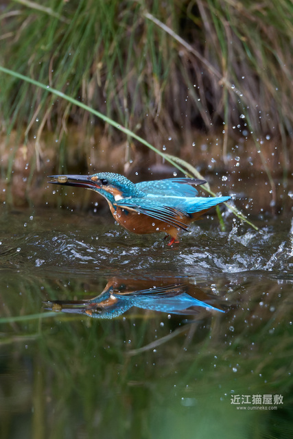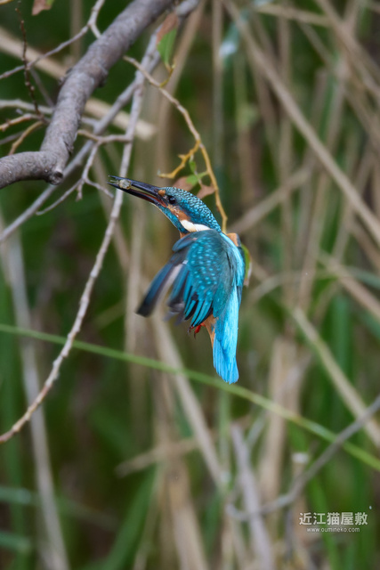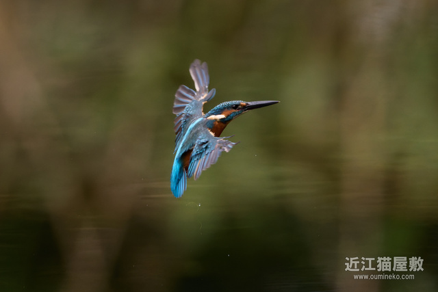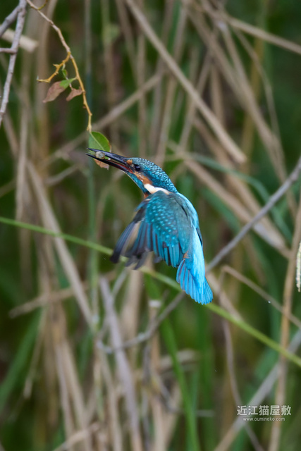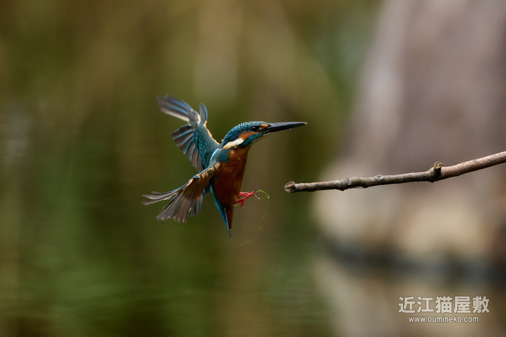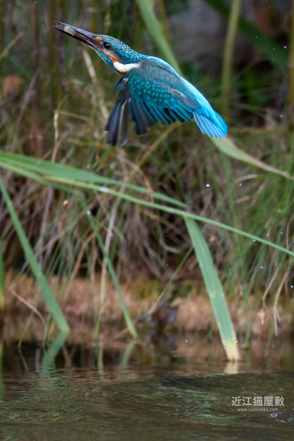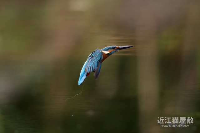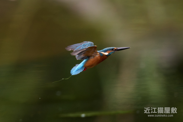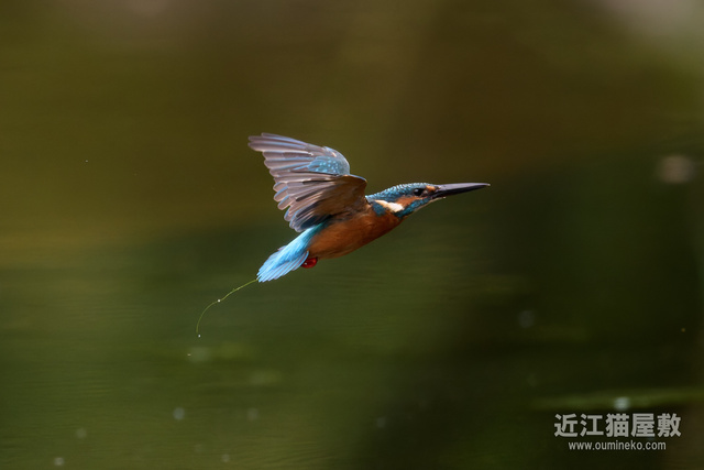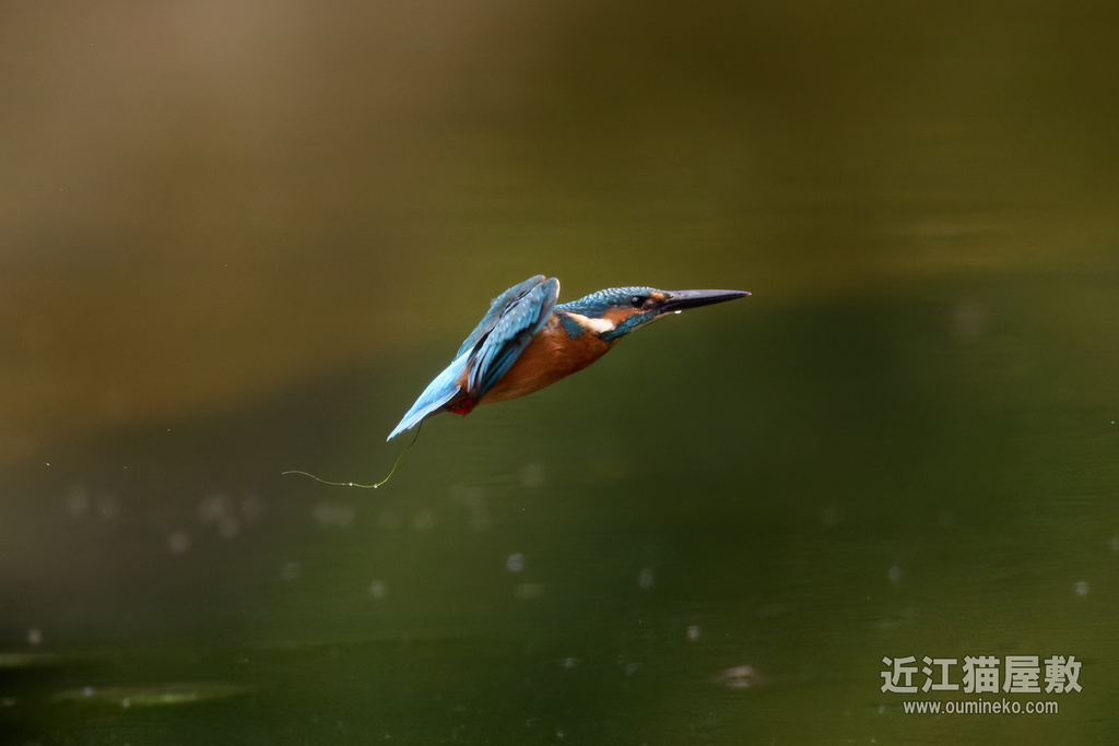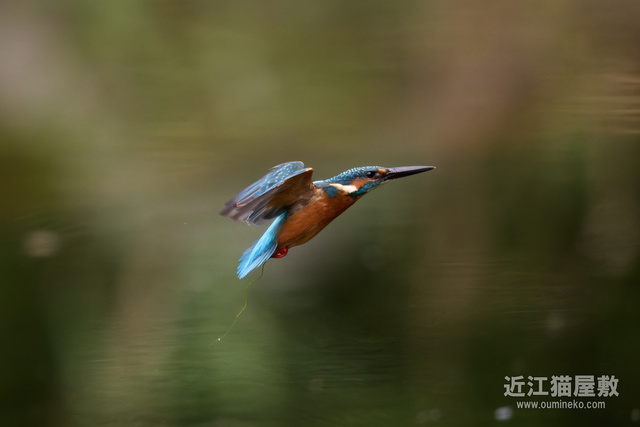 足に水草を絡めながら飛ぶカワセミ。