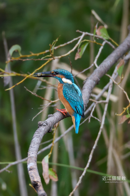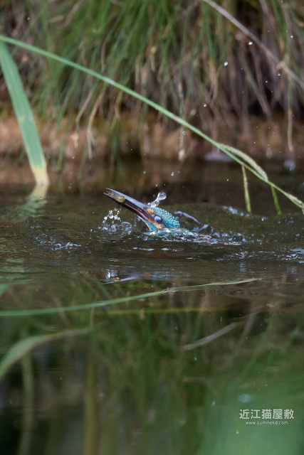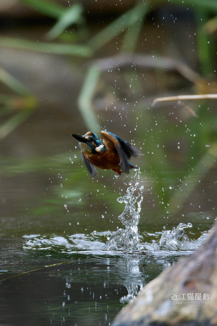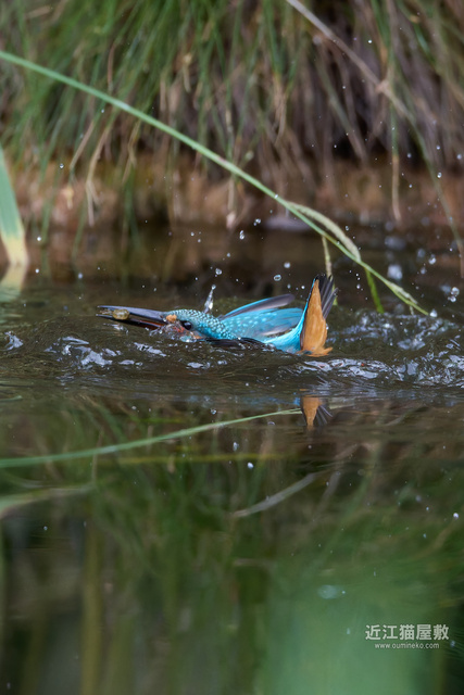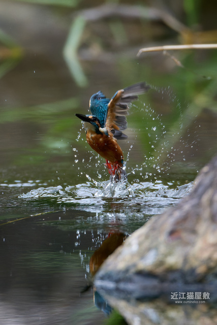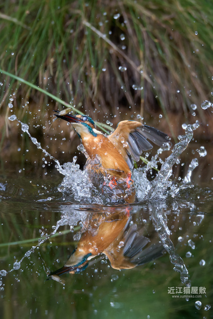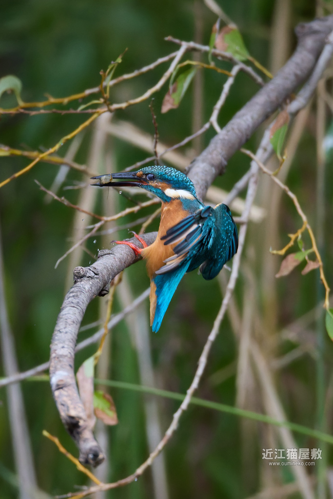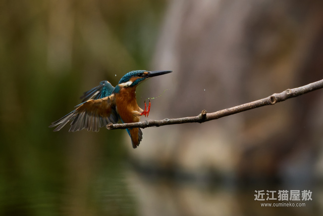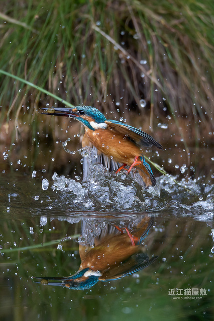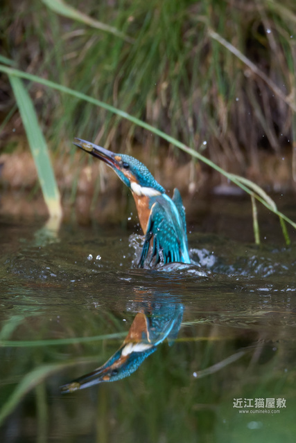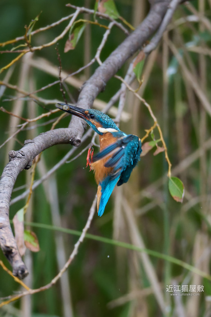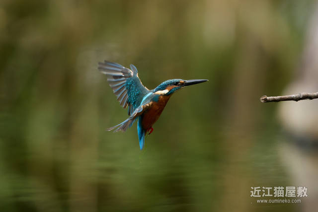 足に水草を絡めながら飛ぶカワセミ。