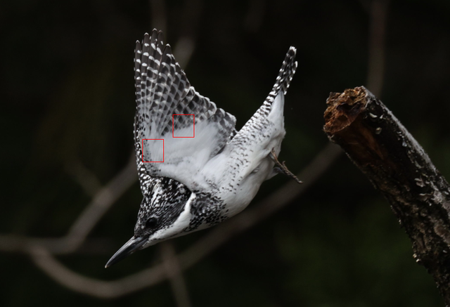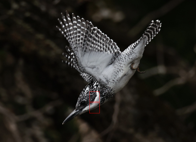 ヤマセミにしてはかなり近かった(30m~35mくらい?)のですが、トリミングするとやっぱりフルサイズ2000万画素は800mmでも解像度が少しきついなというのがよくわかります。