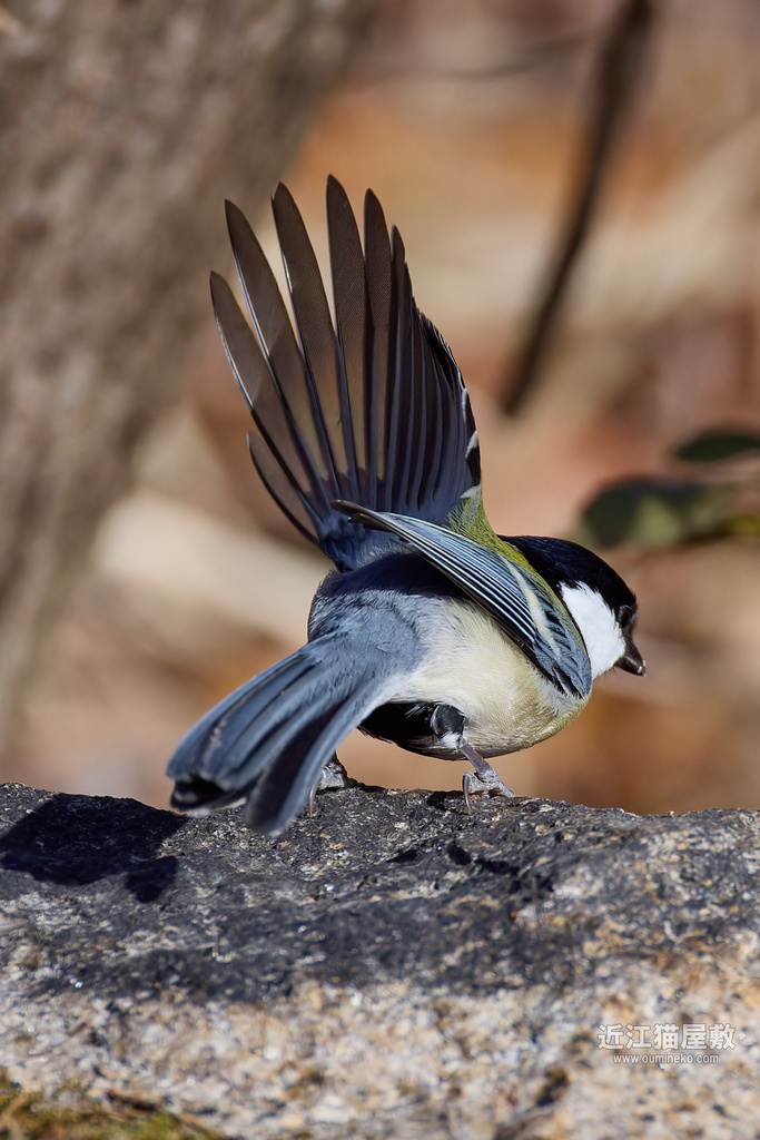 枝から短距離を飛び降りるときとかどういう感じなのかなと思ってたんですが、一瞬羽は動かすものの単純にピョンと飛び降りてますね。