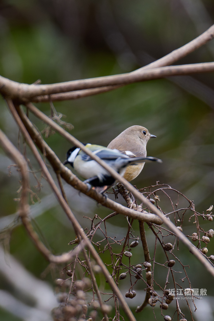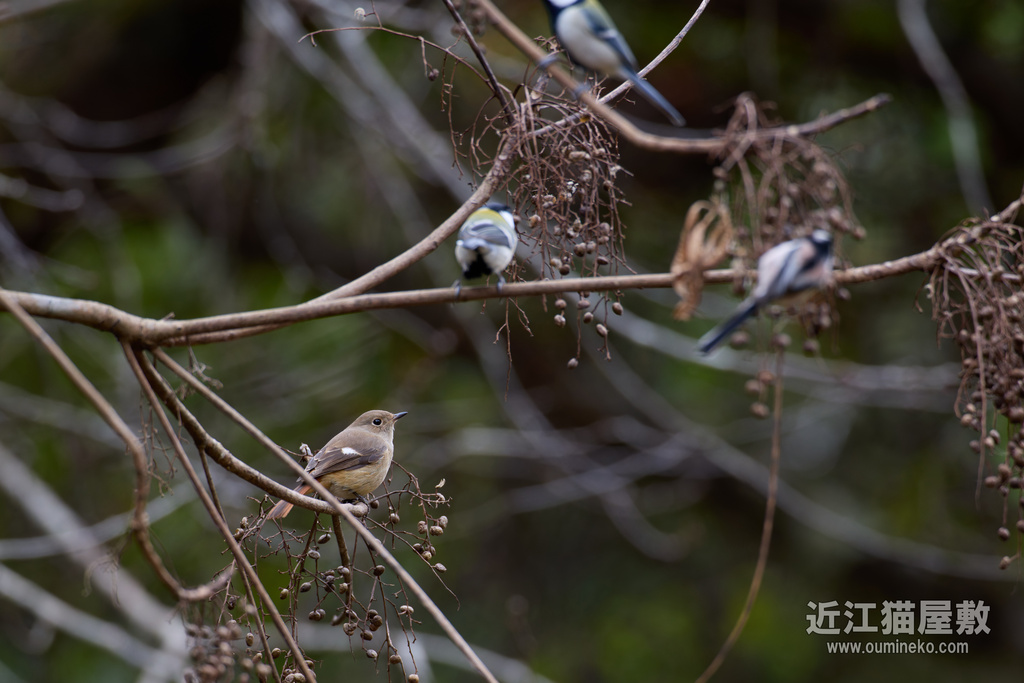 めずらしく、エナガやシジュウカラの群れの中でジョウビタキが黄昏れていました。
