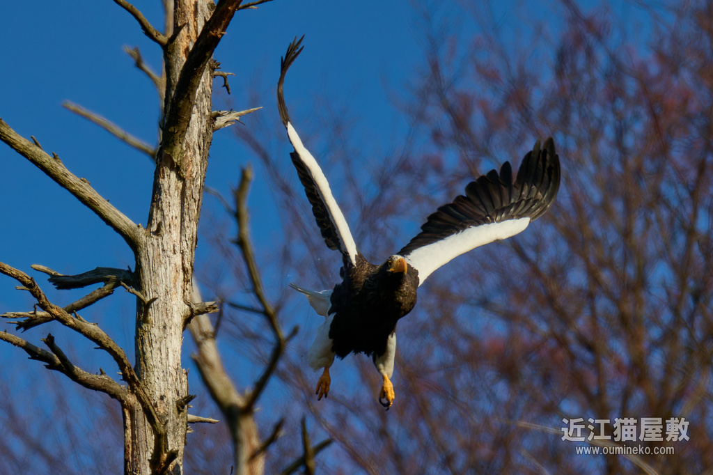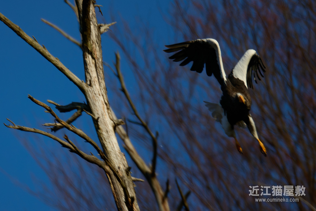 私はオオワシの撮影では飛び出しはレリーズを握って待機しているので、かろうじて飛び出しの数ショットは撮れましたが、体に響く銃声でしたので、少し焦って状況がつかめずこの後の飛翔は撮れず...。