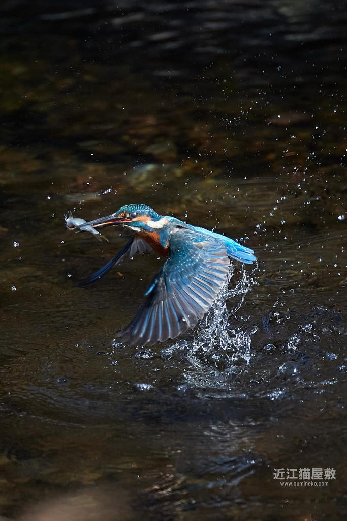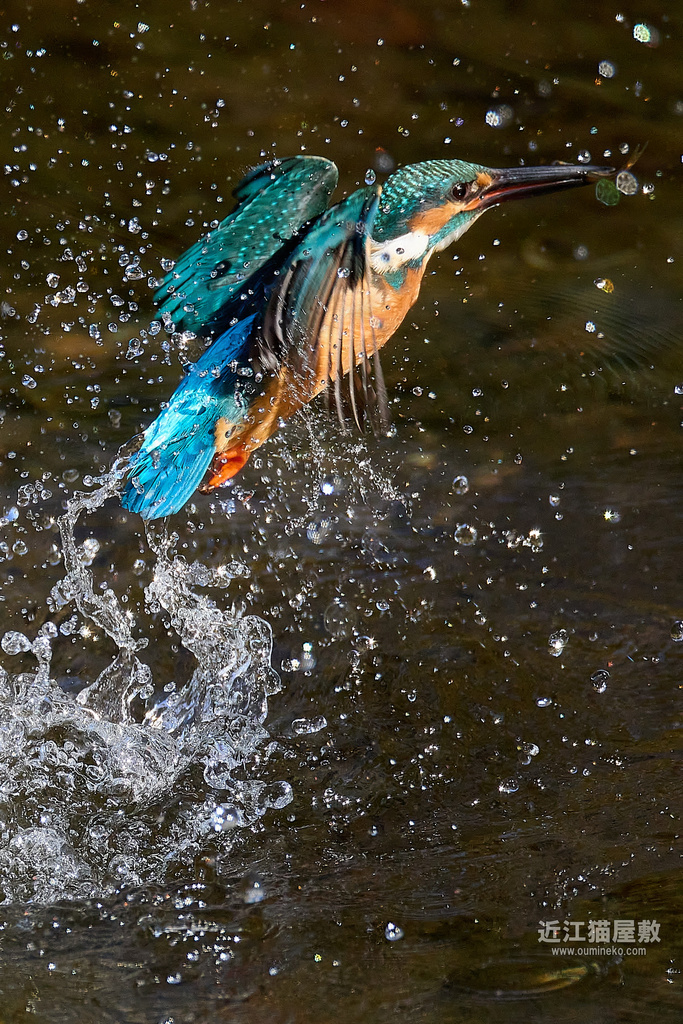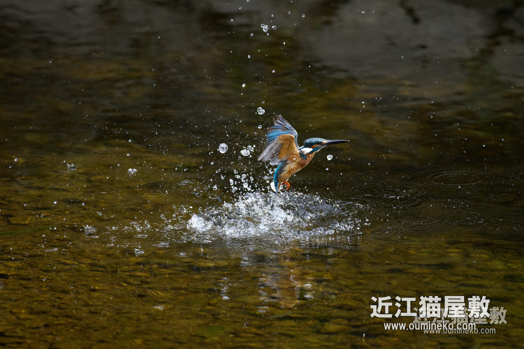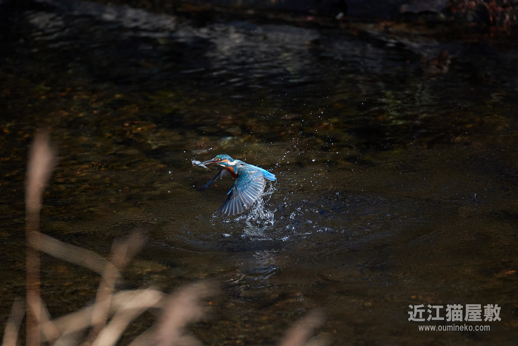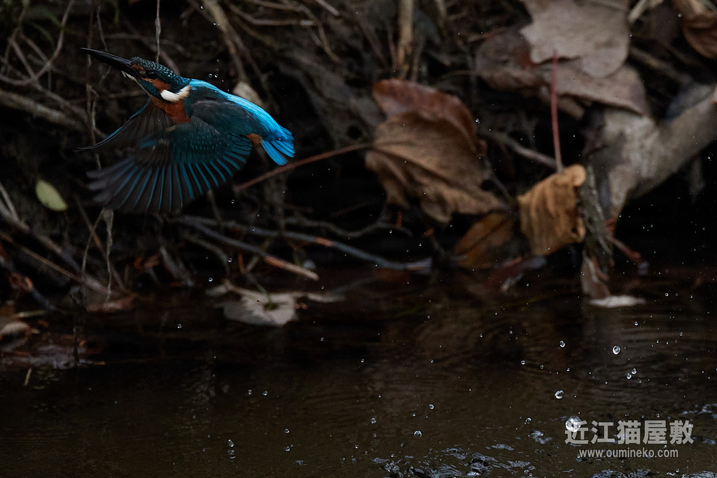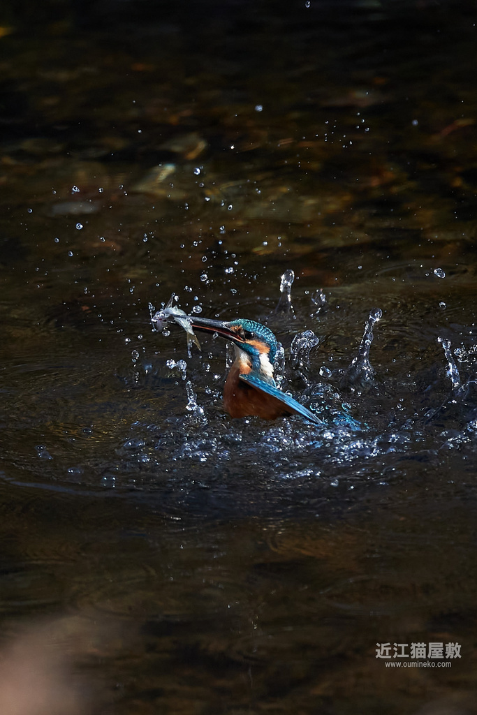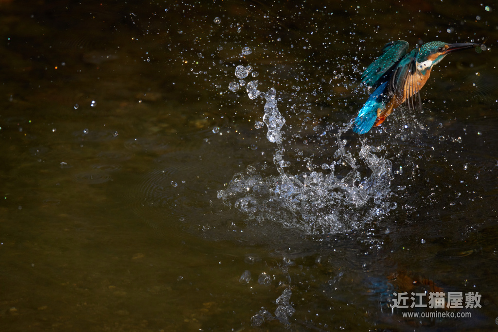 5. カワセミの飛び出し、レンズを振って着水点をとらえる