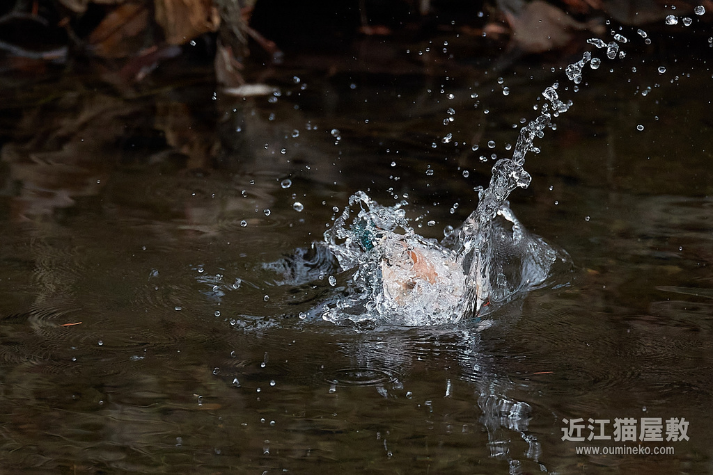 着水と同時にシャッターを切ることで、水しぶきやカワセミがフレーム内にいる状態でAFが開始されますので、2.であらかじめ水面あたりにピントを合わせてあるのもあって「最小限のAF動作」でピントが合います。