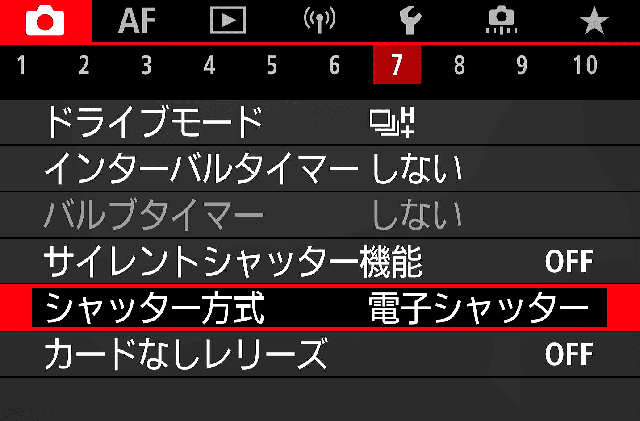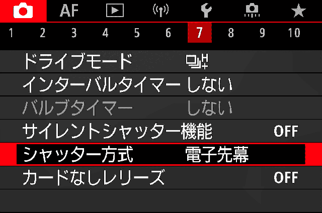 | 7. シャッター方式★ | 電子先幕 どちらでも良いですが、メカシャッターは音が大きすぎるのと振動が凄いので電子先幕を使うことが多いです。 |