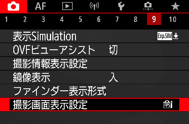 | 9. 表示Simulation | OFF。 明らかにCPU処理食ってる気配があるので。 あと飛び込みで急に明るさ変わることは稀なため、たまに絞りボタン押して確認しています。 |