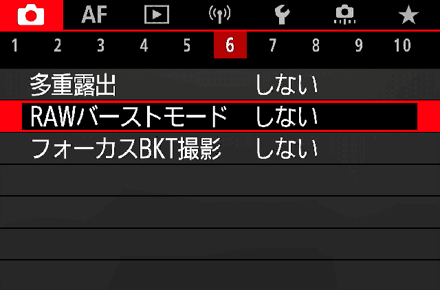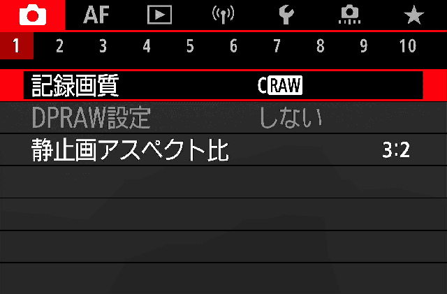 | 1. 記録画質★ | C-RAWならば12秒ほどもつので十分です。 RAWでは15コマ/秒でも4秒程度しかもたないので必須設定。 https://cam.start.canon/ja/C005/manual/html/UG-10_Reference_0100.html |