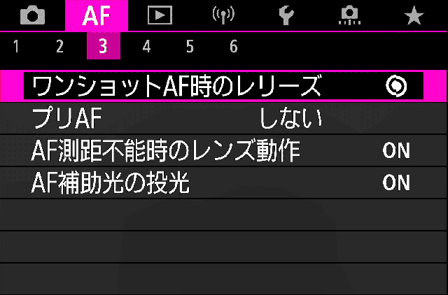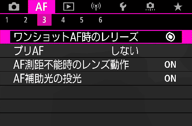 | 3. プリAF | しない これやると何も押してなくても突然AFし始めるのでOFF。 |