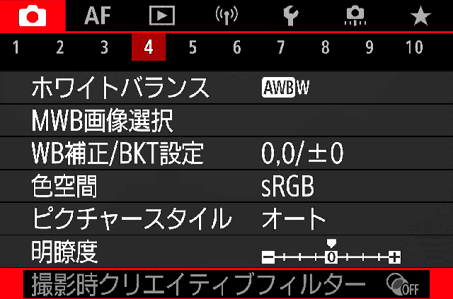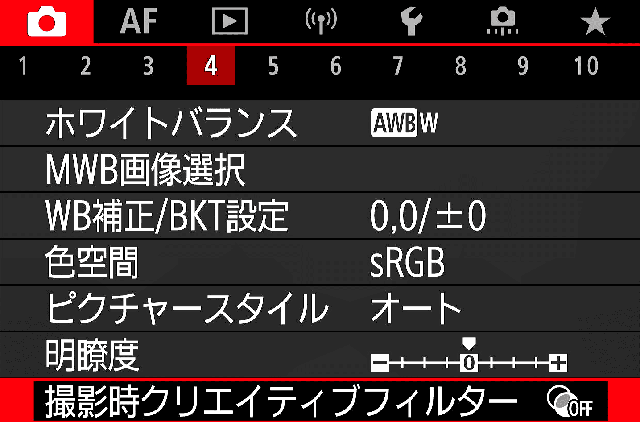 | 4. ホワイトバランス | AWB-W ホワイト優先、これは好みで。RAW現像で気に入らなければ変更できます。 |