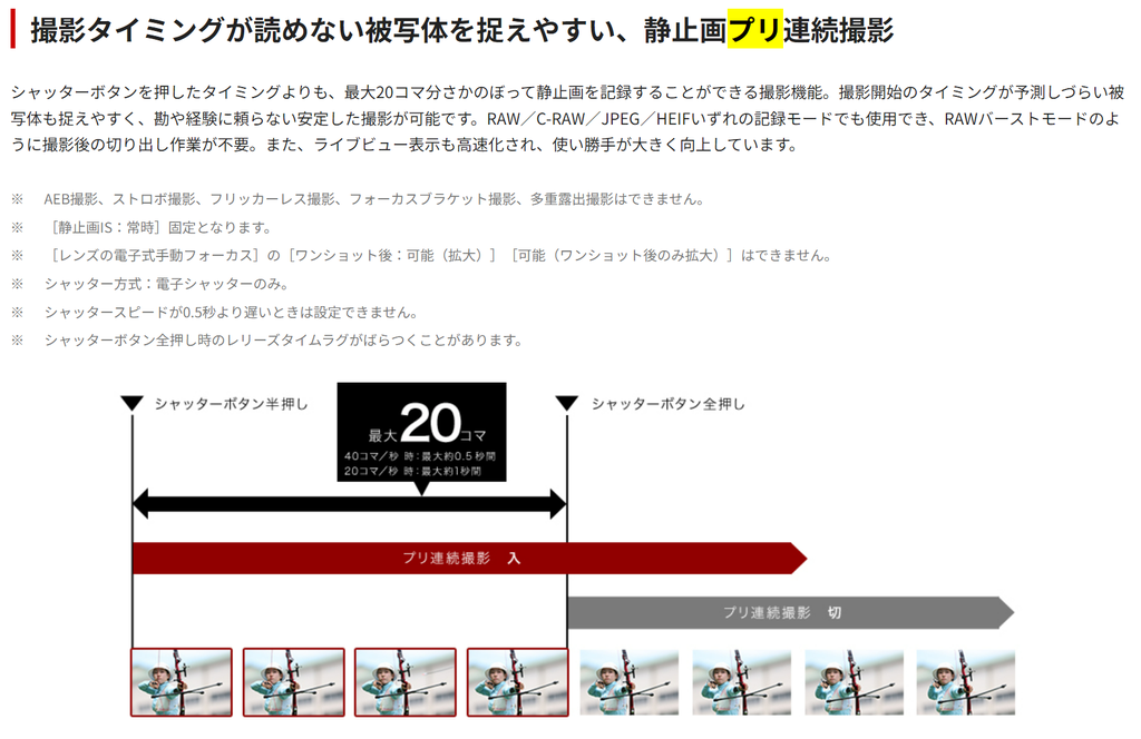 20コマという事なので連写速度が40コマ秒ならば0.5秒、20コマ/秒ならば1秒さかのぼって保存されます。