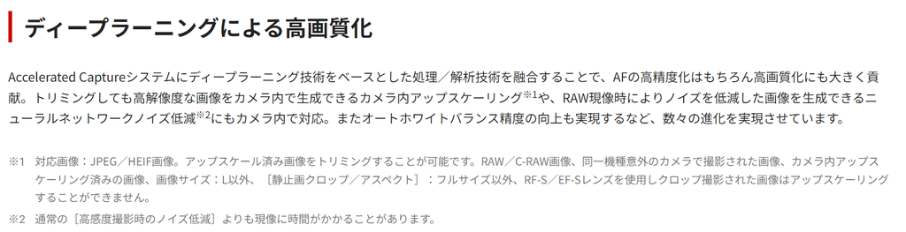 性能はどうかわかりませんが、DxO PureRAWやPhotoShopのアップスケーリングのようなものがCanon純正でサポートされたと考えて問題ないんじゃないかと思います。