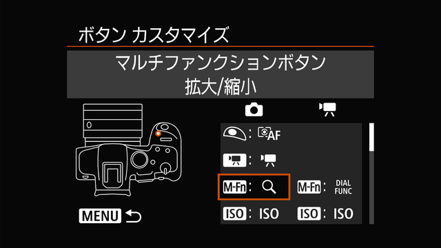 ファインダーを覗きながら拡大ボタンを使う事が非常に多いので、押しやすいM-Fnに拡大ボタンを当ててます。