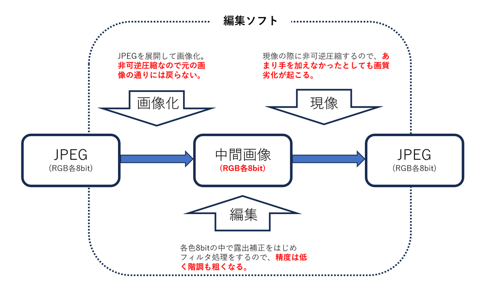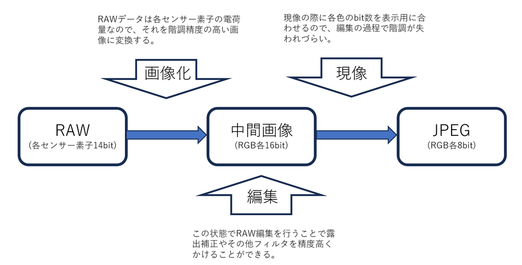 大事なのは「最終出力であるJPEGよりもはるかに階調の細かい中間画像に対して編集を行う」という点。