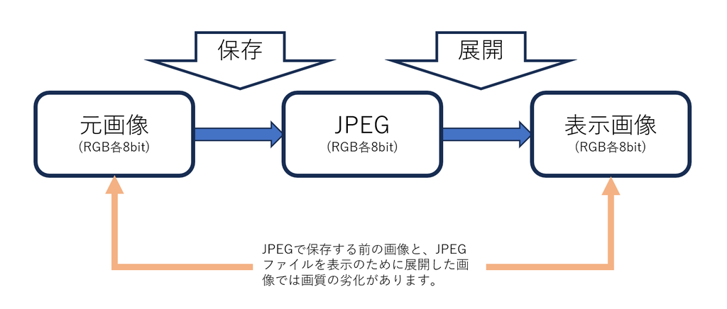 ですので、基本的にはJPEGを読み込んで加工してJPEGを出力する...といったような事をやるとそれだけで画質が劣化するため「編集中は可逆変換のフォーマット(PNGやBMP、PSDなど)で編集して、最終的な出力の段階でJPEGで保存するのが基本」です。