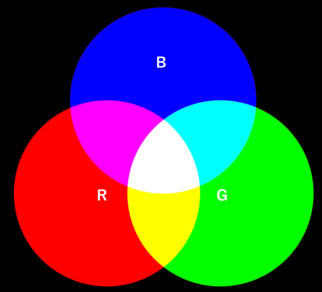 光の三原色は R(赤)、G(緑)、B(青)で、すべての光を最大に混ぜると白に見えます。