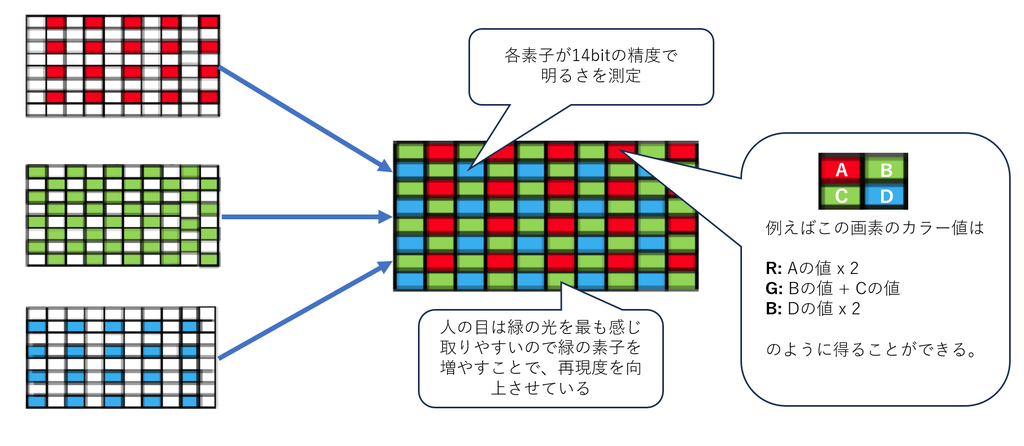 カラー値の計算はもっと複雑な計算で行われていると思われますが、イメージとしてはこの図で書かれたような感じで計算して最終的に画素毎にR(16bit)、G(16bit)、B(16bit) = 48bitカラーの情報を取り出しています。