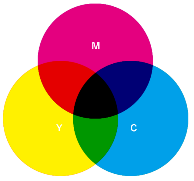 色の三原色はC(シアン)、M(マゼンタ)、Y(イエロー)で、すべての色を最大に混ぜると黒に見えます。