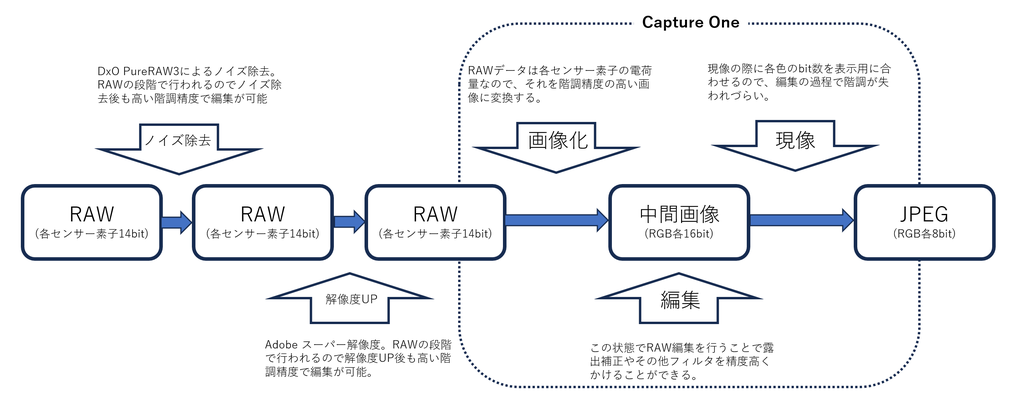 PureRAWなどを使わない、DPPやCaptureOneだけを使ったときのRAW現像フローです。