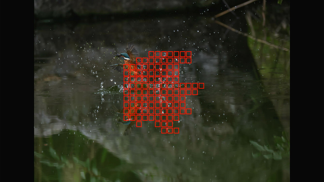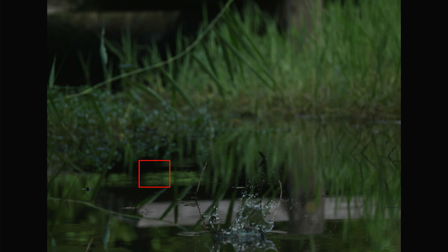 AFエリアをフレーム全体にすると着水までフレーム内のカワセミを捉え続けてくれる可能性は高いと思うのですが、ただ着水~浮上中のカワセミはEOS R5 mark IIのAFでも「動物」として検出してくれないようですので、別の何かを掴んでしまう可能性が高まる気がします。