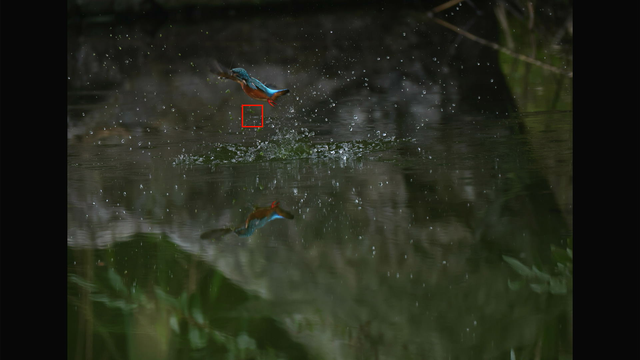 はい...これは照準器の視差で完全にやらかしてしまって、着水したカワセミがフレーム内にはいるものの、AFエリアの外の状態でレンズを止めてしまいました。