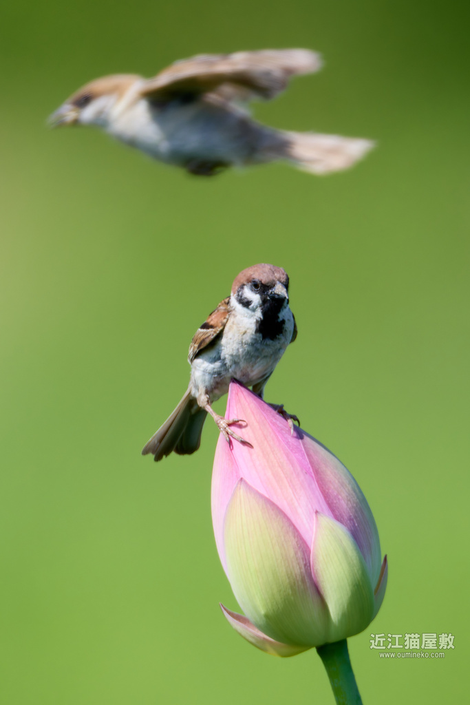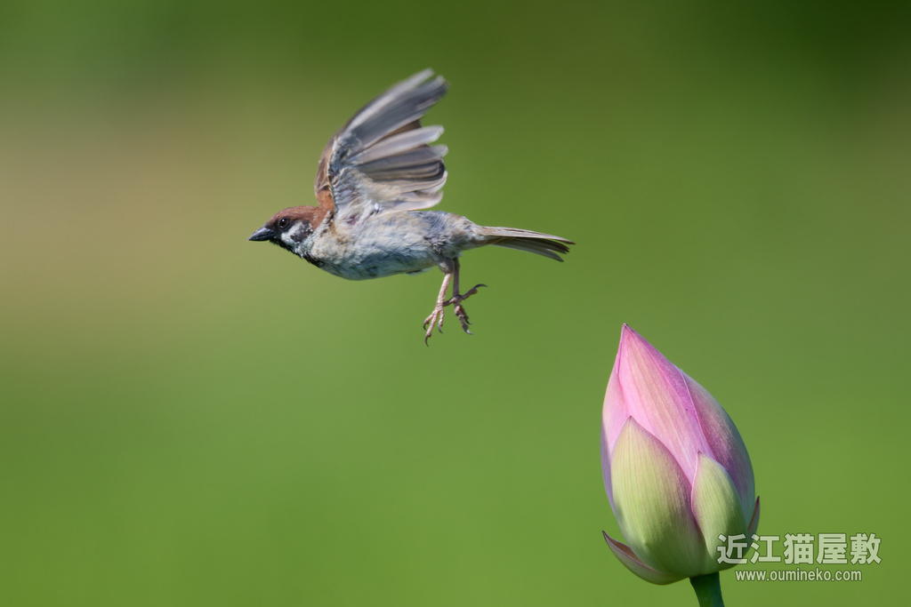 蓮にとまっているスズメを撮っていたら、上空を別のスズメが滑空。