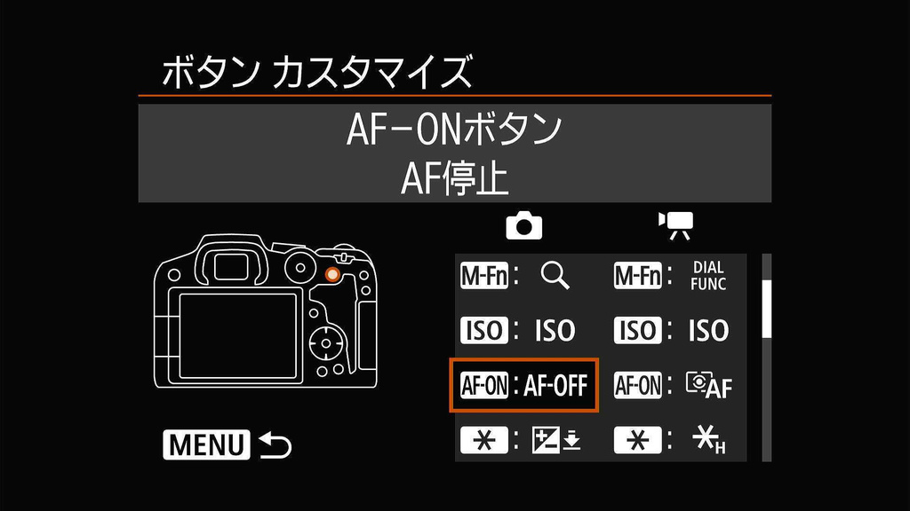 ですので「AF-ON」ボタンに「AF-OFF」機能を、「M-Fn」ボタンに「拡大」機能を割り当てています。