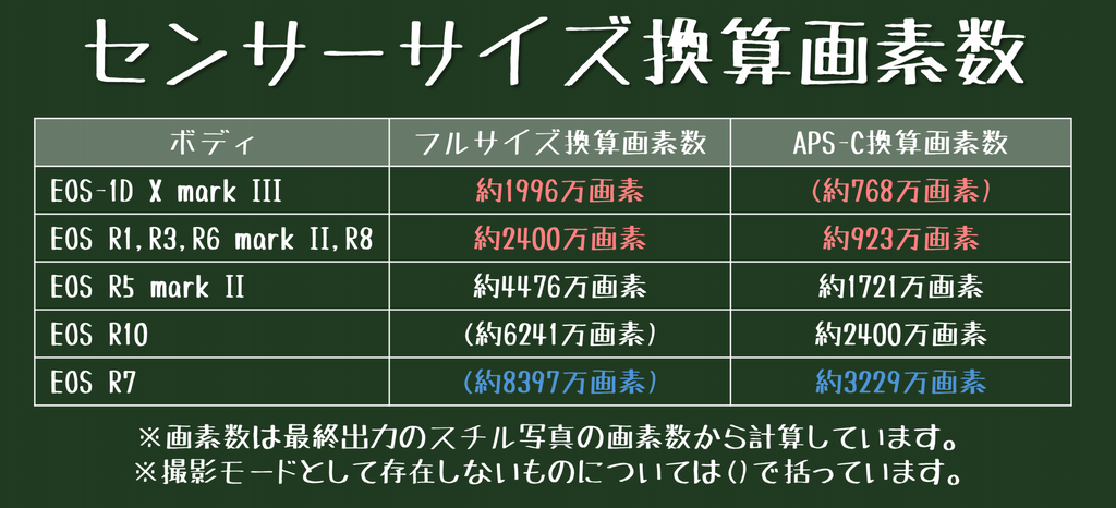 一眼レフで言うとEOS 7D mark IIに結構近い画素ピッチですので、一眼レフ時代から撮ってる人はフルサイズで綺麗なEOS 7D mark IIというイメージで良いんじゃないかと思います。