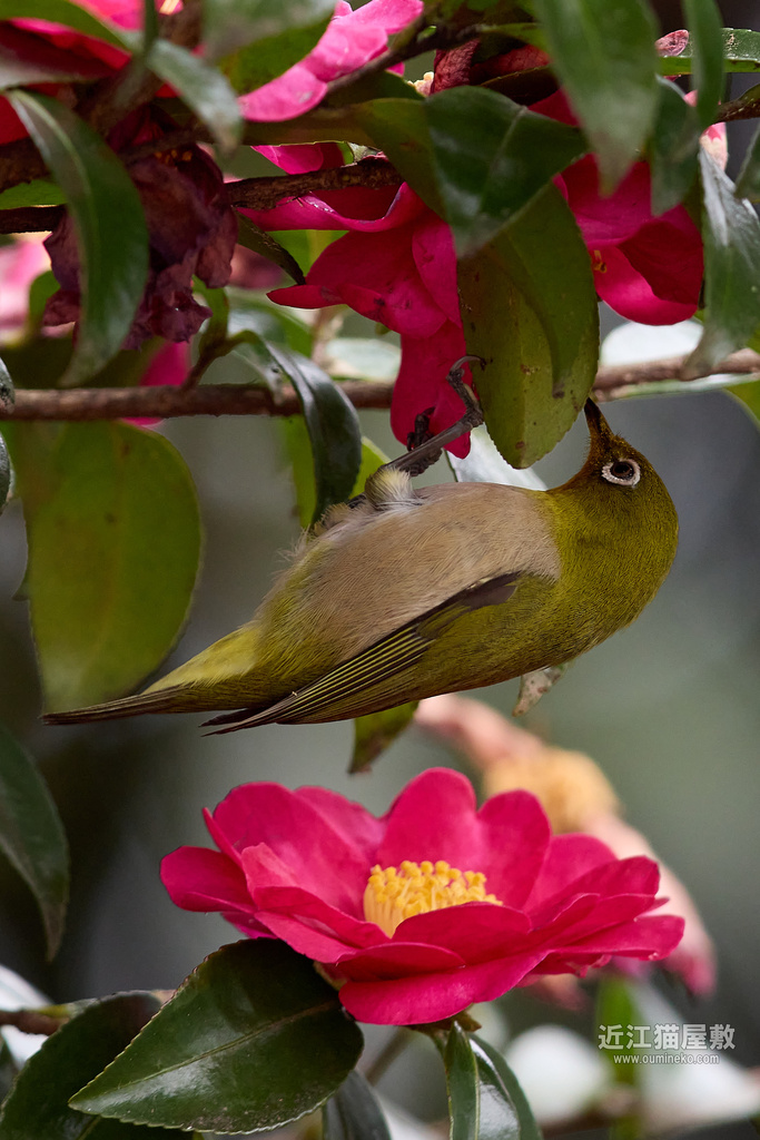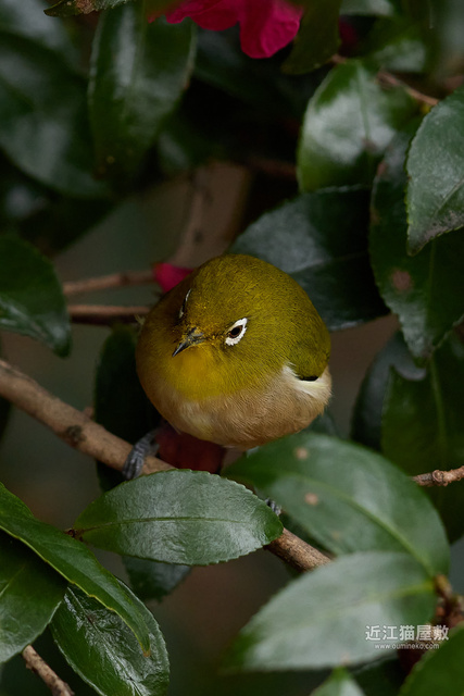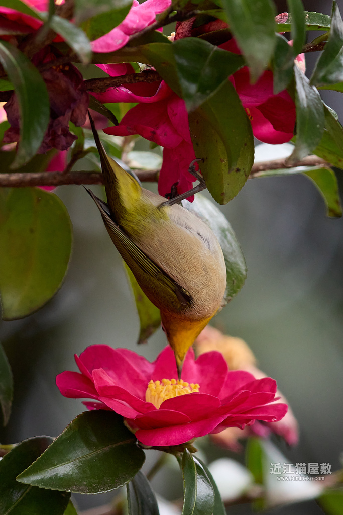 メジロは花の蜜が好物なので、この季節はツバキなんかが咲いていると顔を花粉だらけにして一心不乱になってます。