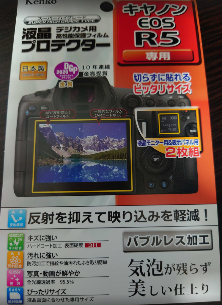 液晶フィルムは、「別にEOS R5のでいいだろ」という事で、EOS R5 mark II対応ってなってないやつを買って貼りましたが、2箇所の液晶のサイズは全く一緒でしたので問題ありません。