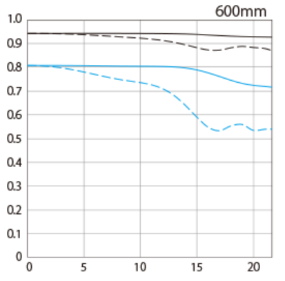 RF100-300mm F2.8L IS USM + RF2XのMTFはこんな感じなので、これの性能が少しだけ向上と考えると500mmであるRF100-500mm F4.5-7.1L IS USMより若干画質が劣る600mm F5.6になりそう。