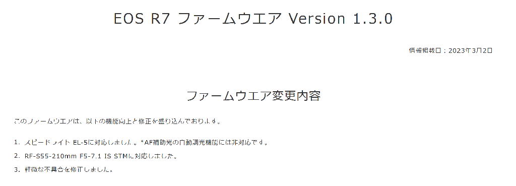 あとNikon Z9なんかはかなり大きなアップデートが降ってくるらしいですが、Canonはほぼそういうのはなくて「軽微な不具合の修正」ばかりですね。