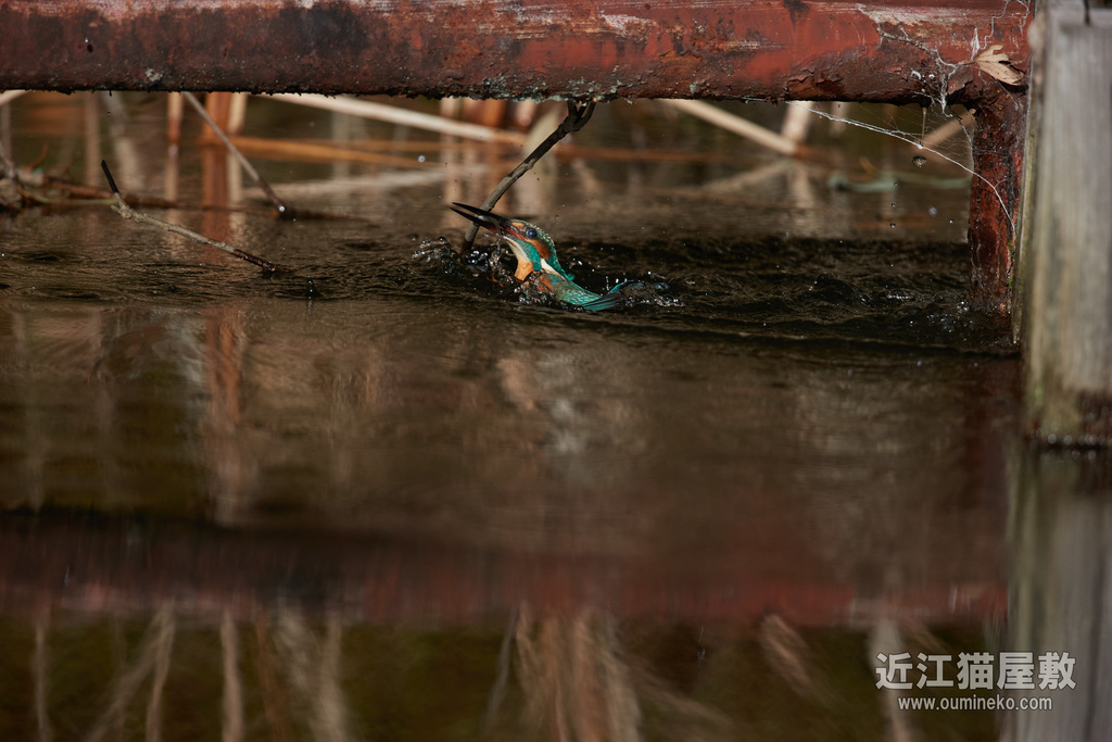 ここのカワセミは飛び込み開始の高さがかなり低いのと、一瞬で浮上してくるのでレンズの振りが間に合わないことが多く。