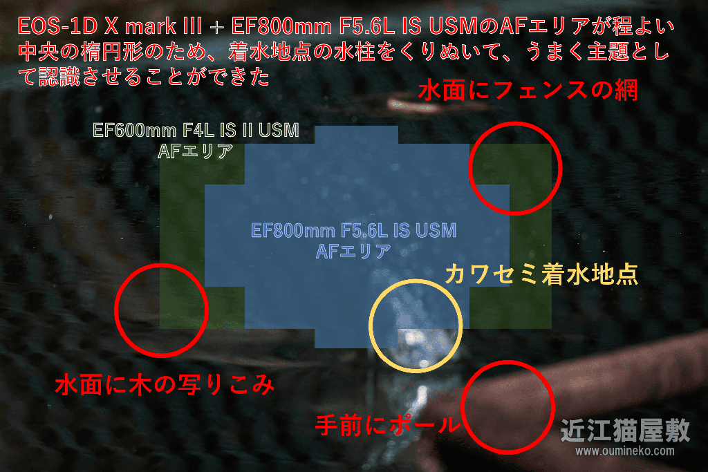 着水時は中央でとらえるのが良いのですが、水柱がたったくらいで着水点を少しフレームの下に配置できると綺麗におさまるものの、視差の加減はかなりアナログで難しいですね。
