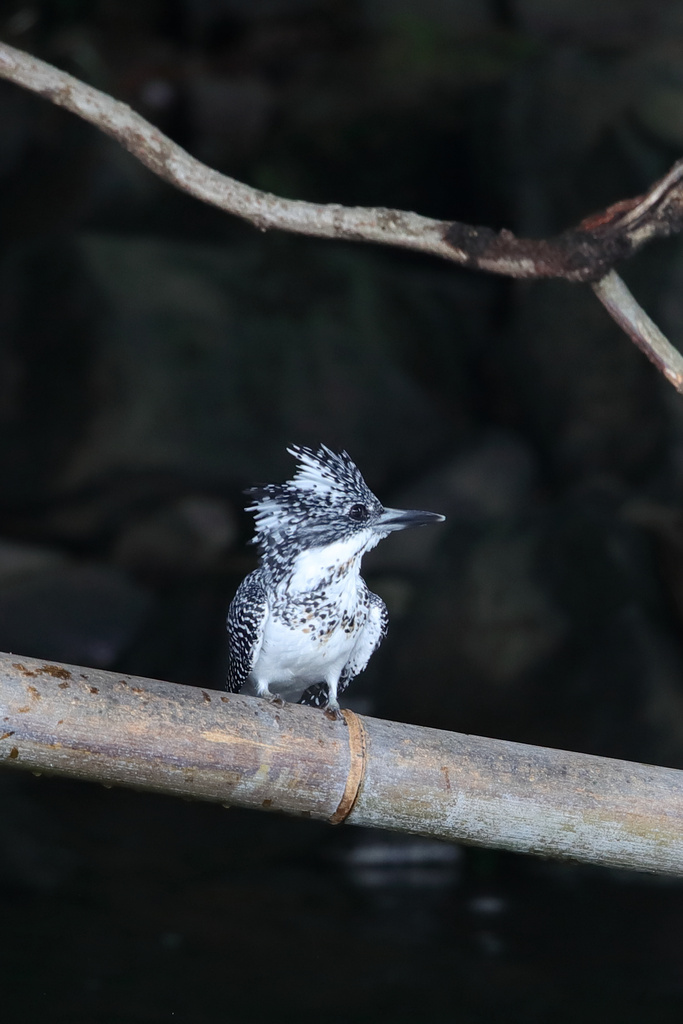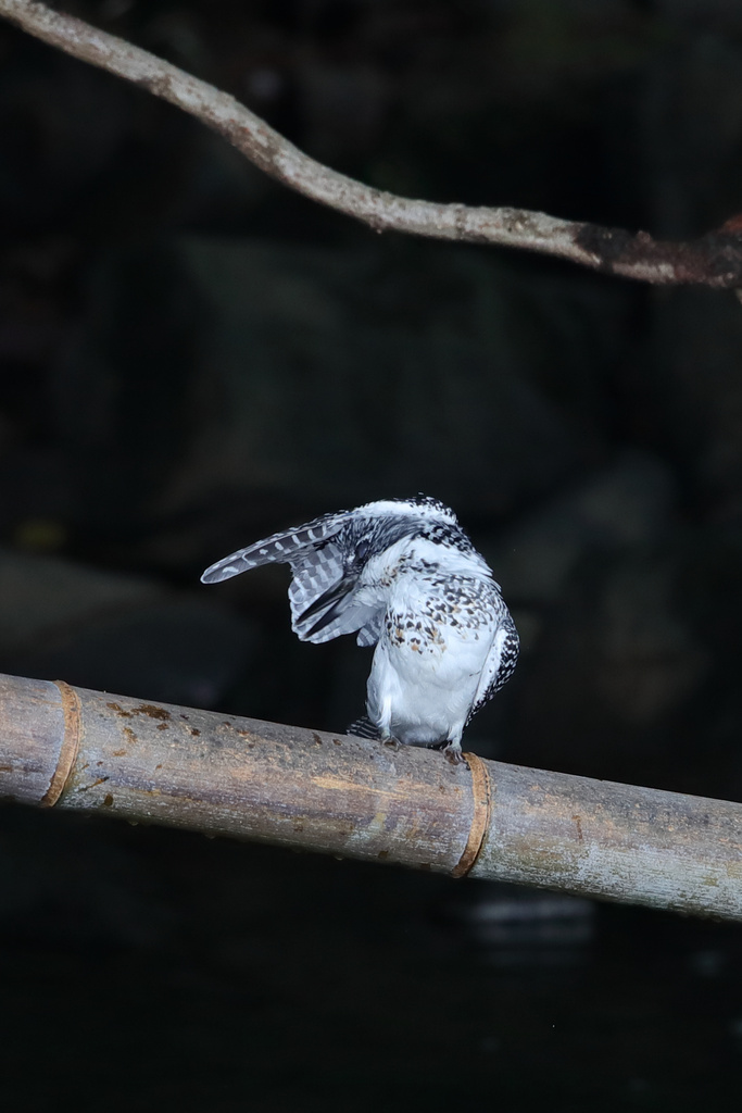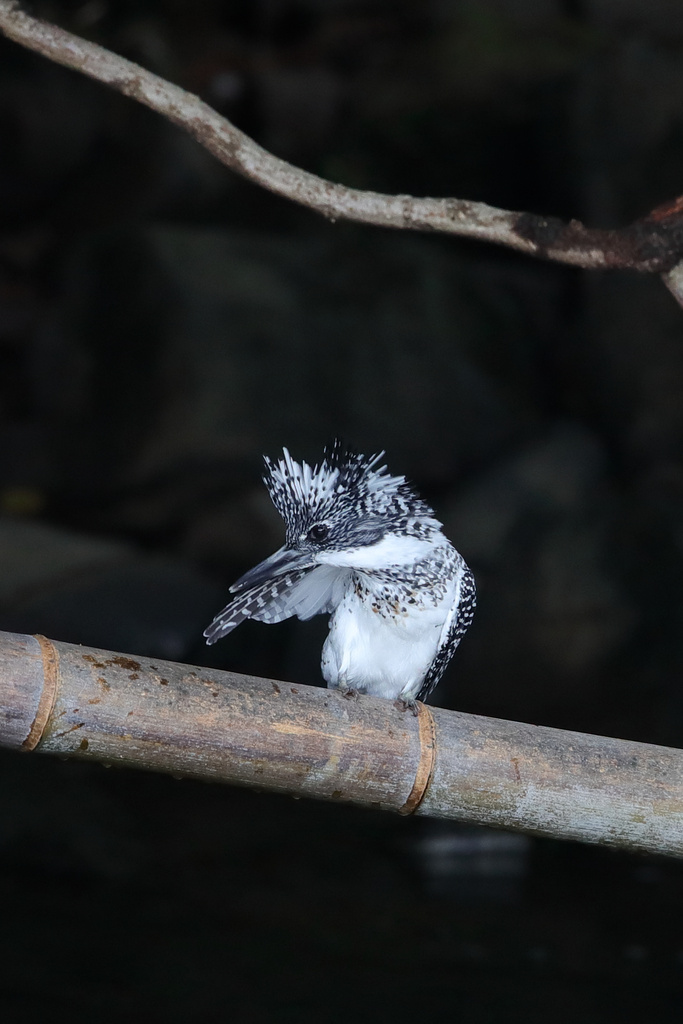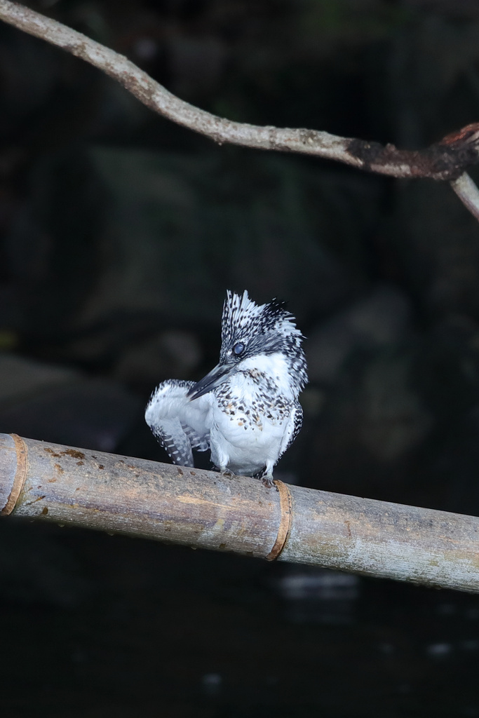 途中、釣り人が荒らしに来たのでダメかなと思っていましたが待ち続けること1時間以上、とうとうヤマセミが待ち構えていた目の前の枝に止まってくれました。